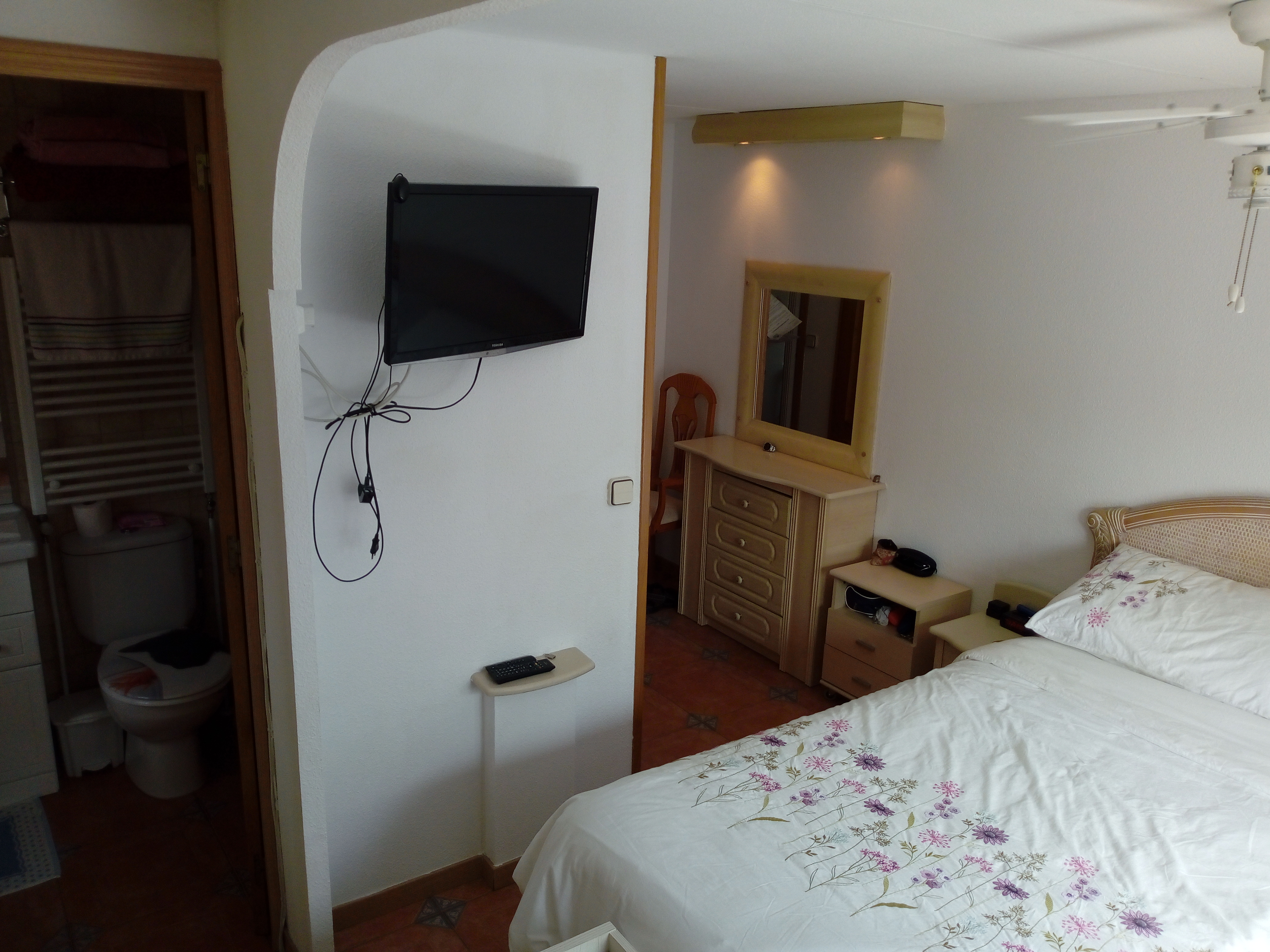 A hallway leads to a family shower room and 3 bedrooms. Shower room with walk in shower, sink and toilet. Master bedroom with a king size bed with a lift up base for extra storage. 2 bedside cabinets, dressing table and chair. Fitted wardrobes. En-suite bathroom with a bath and shower, sink & toilet.