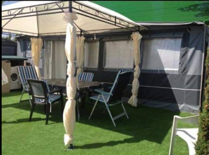 Tabbert caravan and new awning, renovated to a very high standard, located on a quiet part of el raco. The awning has been fully cladded throughout, with light grey laminate flooring, new white kitchen with integrated fridge, built in gas hob with fan assisted electric oven, kitchen is finished off with light grey wall tiles. Living area has new corner sofa which turns into a double bed, 40inch wall mounted television grey blinds to windows. Also new gas heater. Caravan is a large one bedroom, with air con.with double bed, double wardrobe and a set of drawers. Wall mounted television in bedroom, also has been cladded and has same laminate flooring, there is blackout blinds to caravan windows. There is also a large toilet area. There is hot water in both caravan and awning.outside is a lovely patio area, with artificial grass with gazebo with table and chairs, also bunker shed which house a new washing machine and new chest freezer, there is also a tall shed for storage. Must be seen to be appreciated.