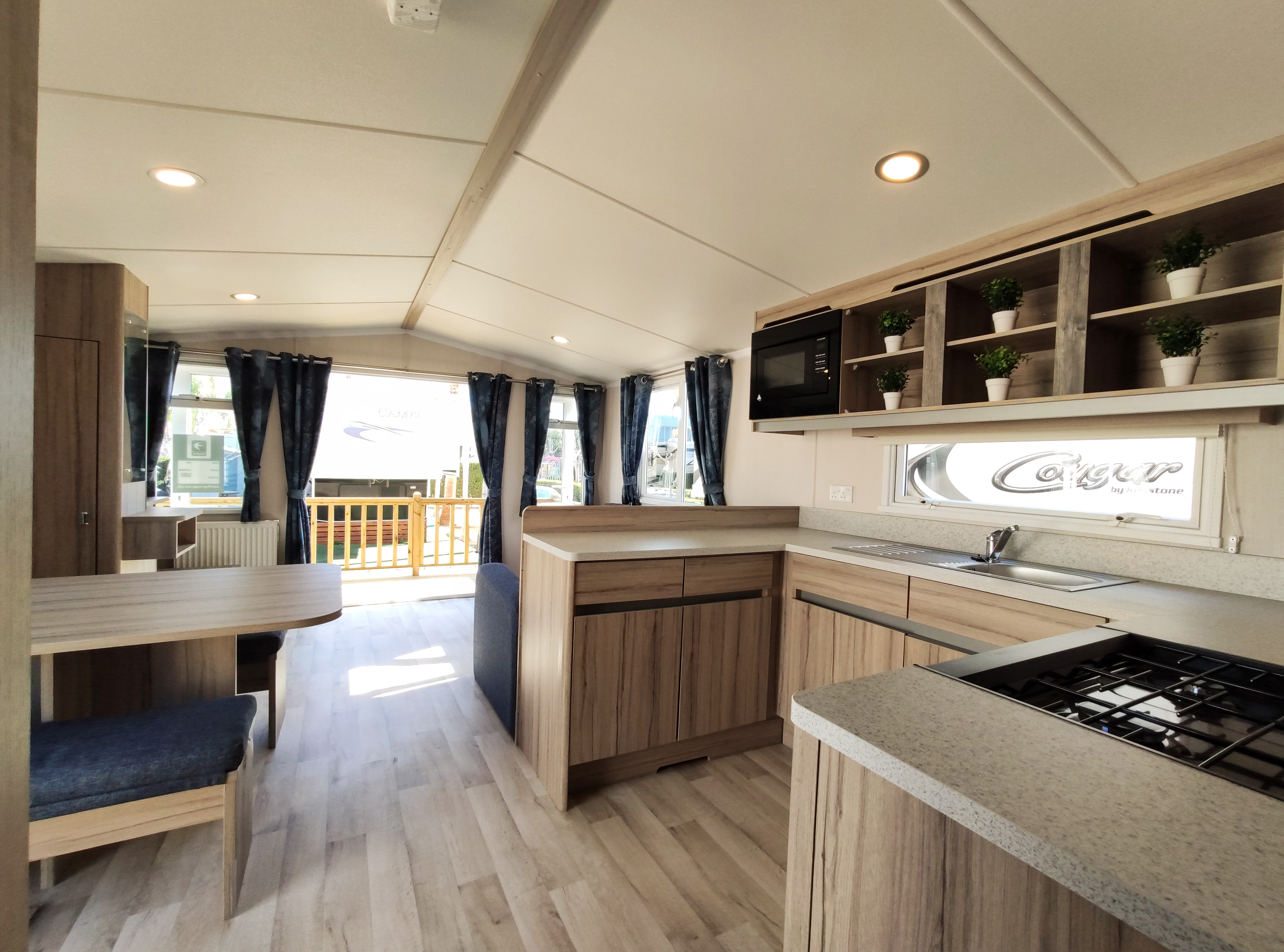 This high spec mobile home has white UPVC windows, condensing gas combi-boiler central heating and hot water system. Low energy LED lighting and Climate control.