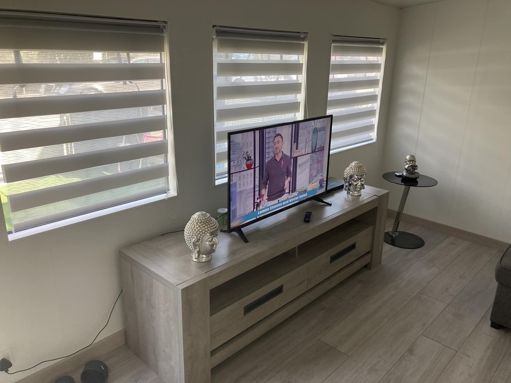There is a sofa bed with a TV and storage units. Day and night blinds fitted.